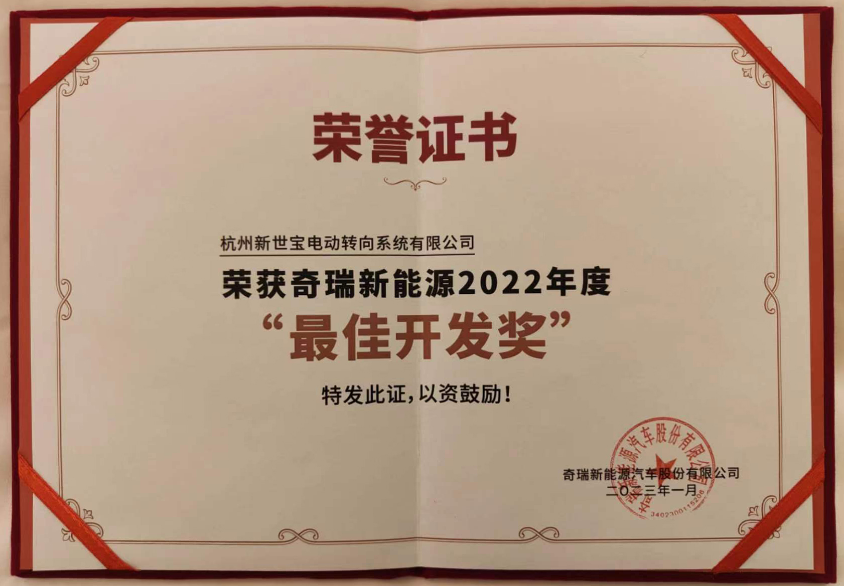 奇瑞新能源最佳开发奖